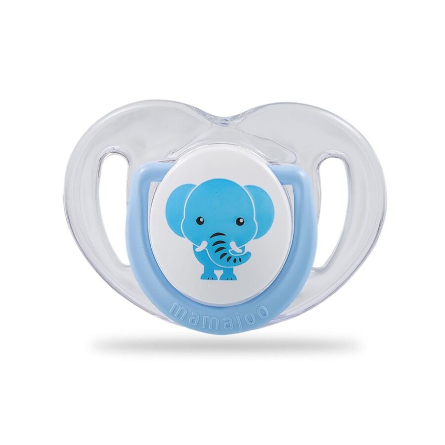 Blister ambalajlı ikili paketlerde 1 Fil desenli ve 1 düz mavi renk uyumlu Mamajoo emzik bulunur