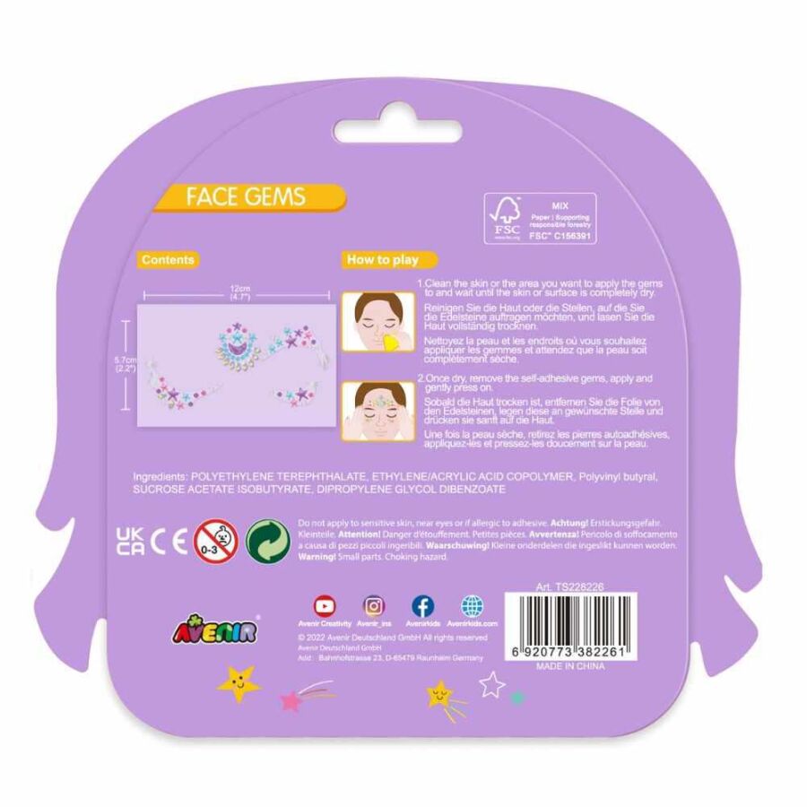 Avenir Stars Yüz Mücevherleri, 3 yaş ve üzeri çocukların yüzlerini parıltılı yıldız taşlarıyla süsleyebileceği eğlenceli bir yüz aksesuar setidir. Yıldız temalı tasarımlarıyla doğum günü partilerine, kostüm oyunlarına ve özel günlere ışıltılı bir dokunuş katar.