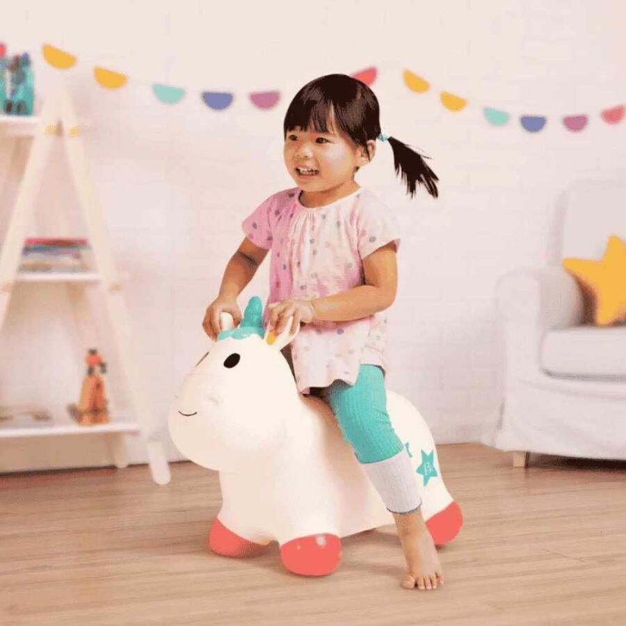 B.Toys Zıplayan Unicorn, çocukları hareket etmeye teşvik eden eğlenceli bir zıplama oyuncağıdır. Dört sağlam ayağı sayesinde yere dengeli şekilde basar ve çocukların güvenle zıplamasına olanak tanır. Kulak kısımları minik ellerin rahatça kavrayabileceği şekilde tasarlanmıştır.