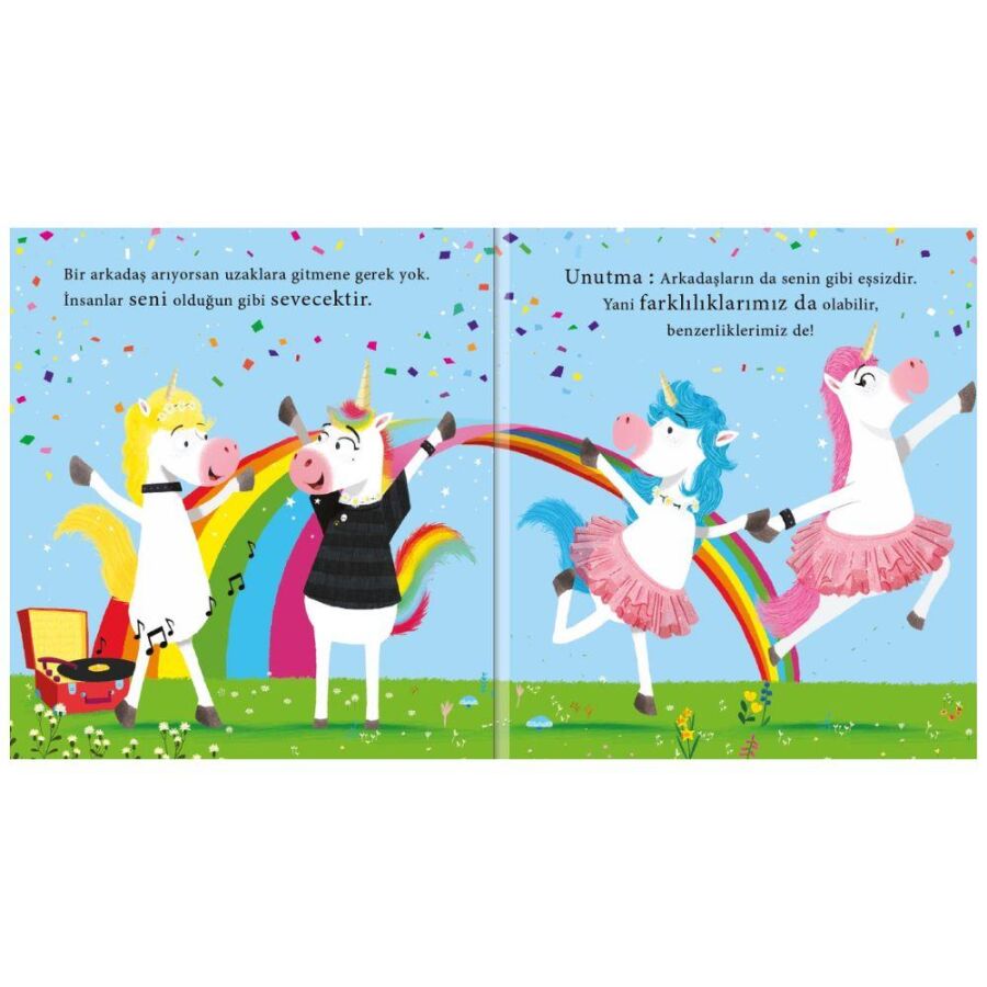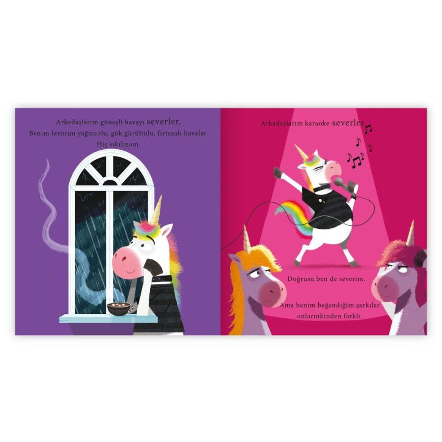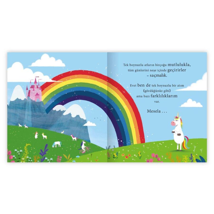 Küçük okurlar için hem eğlenceli hem de içten bir mesaj taşıyan Gökkuşağını Sevmeyen Tek Boynuzlu At, özgünlük ve bireysellik temalarını samimi bir dille aktarıyor.