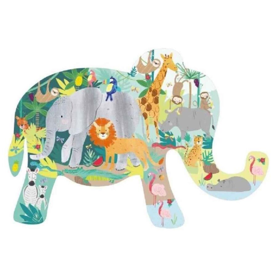 Floss & Rock 40 Parça Fil Şekilli Puzzle Jungle, hem kutu tasarımı hem de tamamlanmış haliyle fil formunda olan özel bir yapbozdur. Jungle koleksiyonunun renkli ve eğlenceli detaylarını bir araya getiren bu puzzle, tamamlandığında büyük bir fil silueti oluşturur.