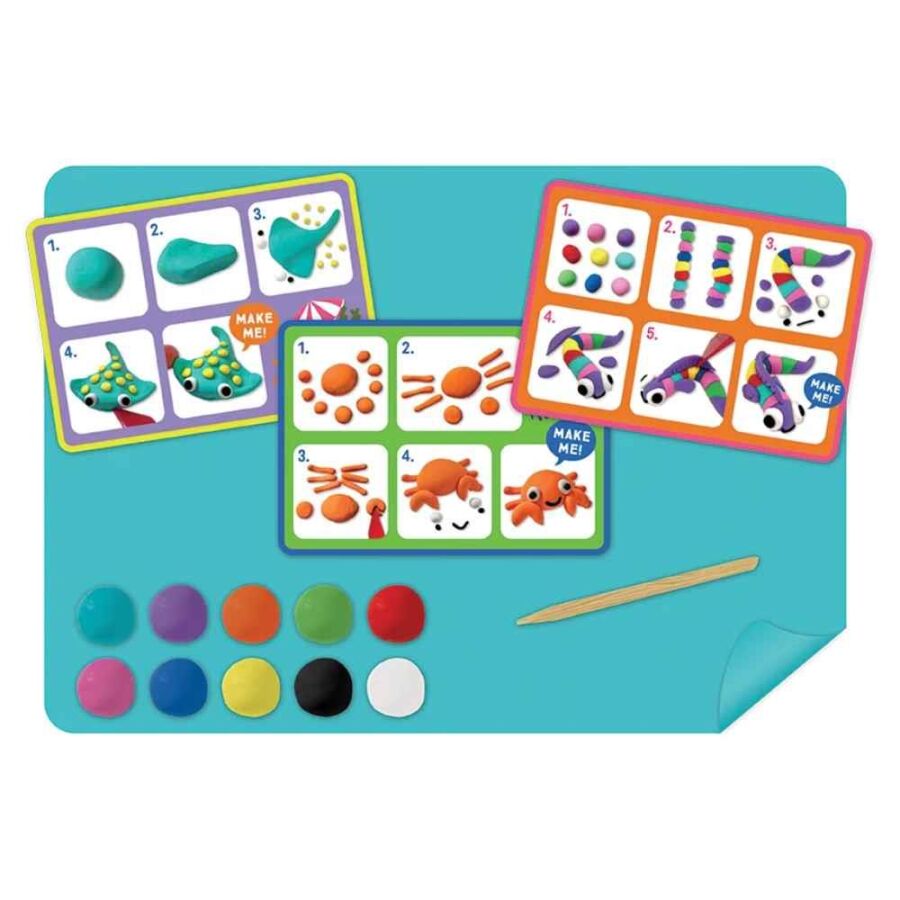 Set içerisinde 10 farklı kil rengi ve 10 eğlenceli deniz karakteri yapabilmek için hazırlanmış 5 adet çift taraflı adım adım talimat kartı bulunur. Şekillendirme sürecini kolaylaştıran parlak silikon mat ve bambu modelleme kalemi sayesinde detaylı figürler oluşturmak oldukça pratiktir.