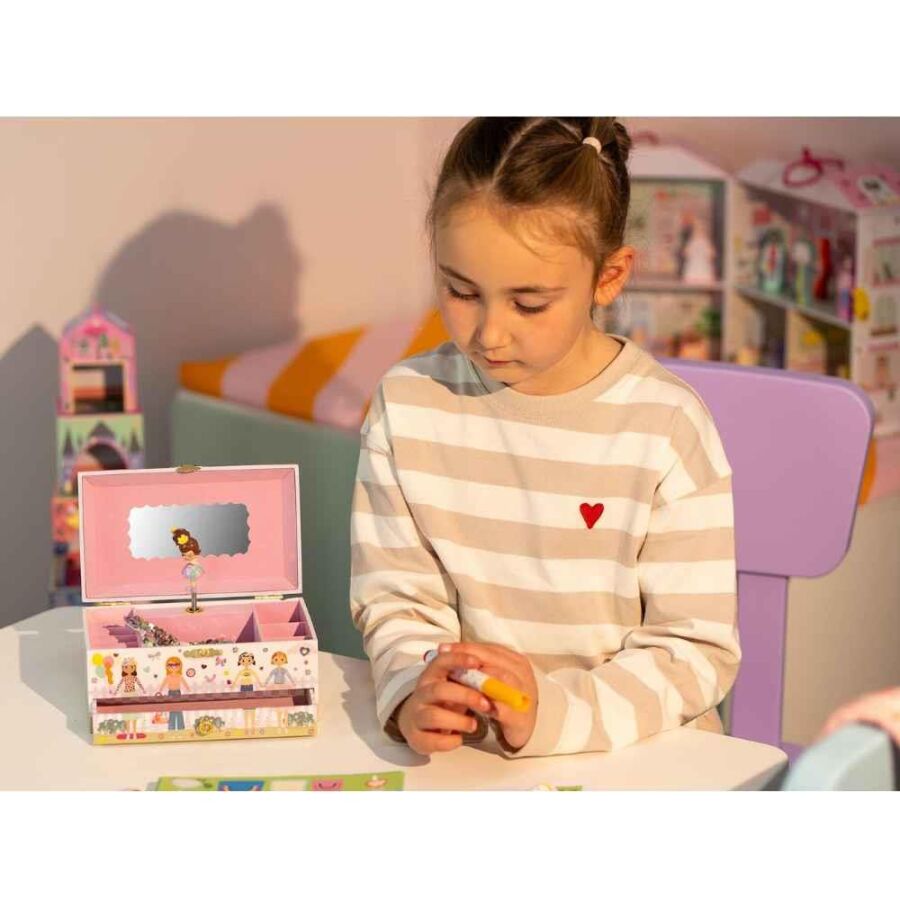 Arka kısmındaki kurma mekanizması çevrildiğinde “You’ve Got a Friend in Me” melodisi çalar ve kutunun içindeki prenses figürü dönerek minik bir dans gösterisi sunar. İnci görünümlü taşıma sapı sayesinde çocuklar mücevher kutusunu kolayca taşıyabilir ve sevdikleri eşyalarını güvenle saklayabilir.