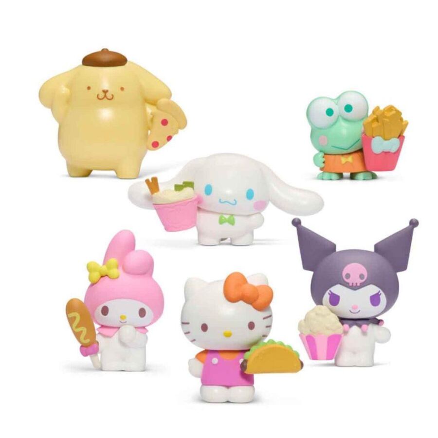 6 farklı karakter figürü: Hello Kitty, My Melody, Kuromi, Cinnamoroll, Keroppi ve Pompompurin