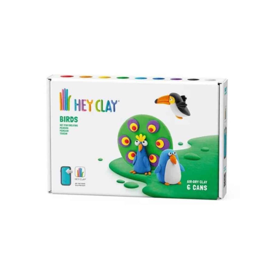 Hey Clay Toucan, Penguin, Peacock seti; çocukları tropik ve renkli kuşların eğlenceli dünyasıyla buluşturur. Set içerisinde 9 farklı renkten oluşan toplam 6 kutu kil bulunur ve bu içerikle 3 farklı kuş karakteri tasarlanabilir.