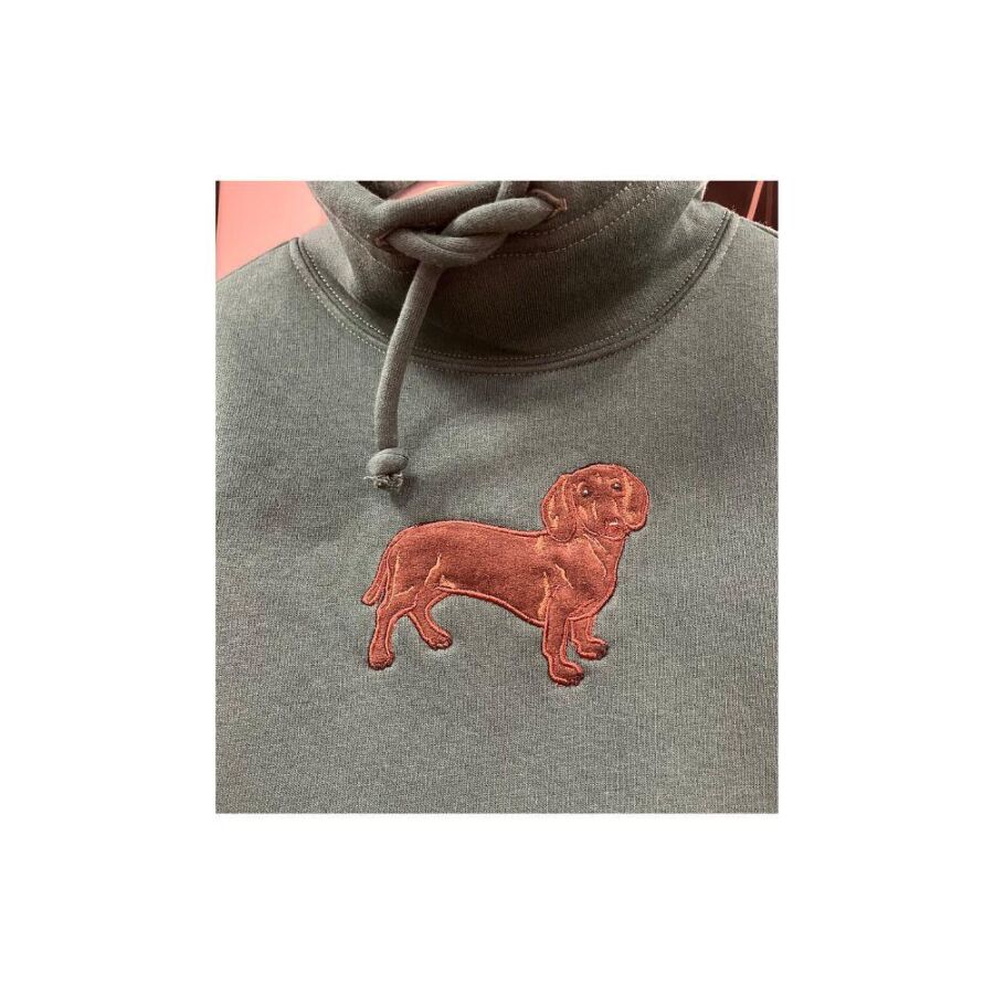 Karamela marka dik yakalı sweatshirt modelimizin üzeri köpek nakışlıdır.
