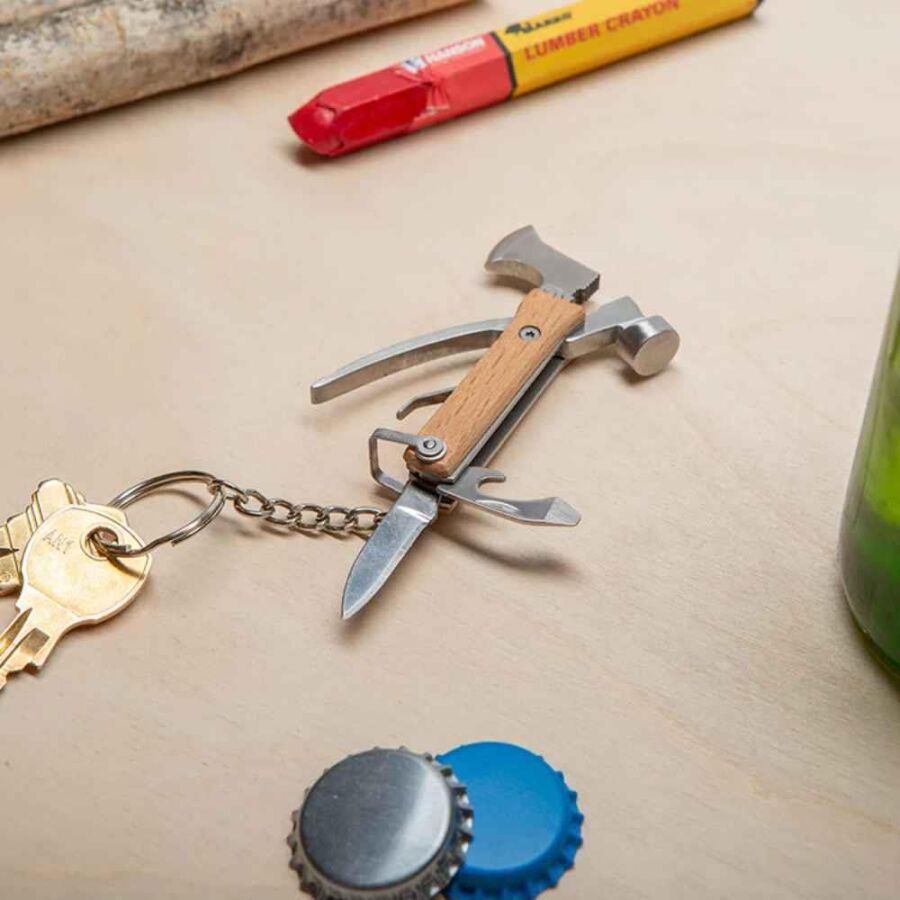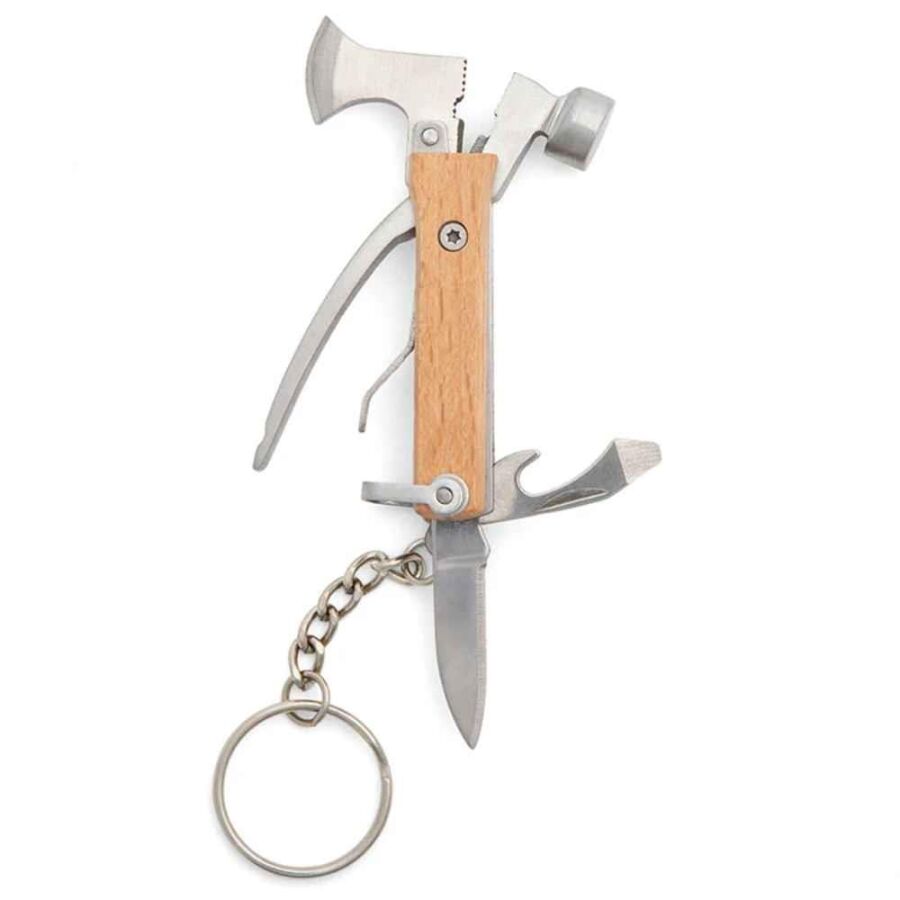 Bu özel çok amaçlı alet içerisinde 6 farklı işlev yer alır: mini balta, çekiç, şişe açacağı, düz tornavida, pense ve bıçak. Tek bir üründe birden fazla kullanım sunarak ihtiyaç anında hızlı çözüm sağlar.