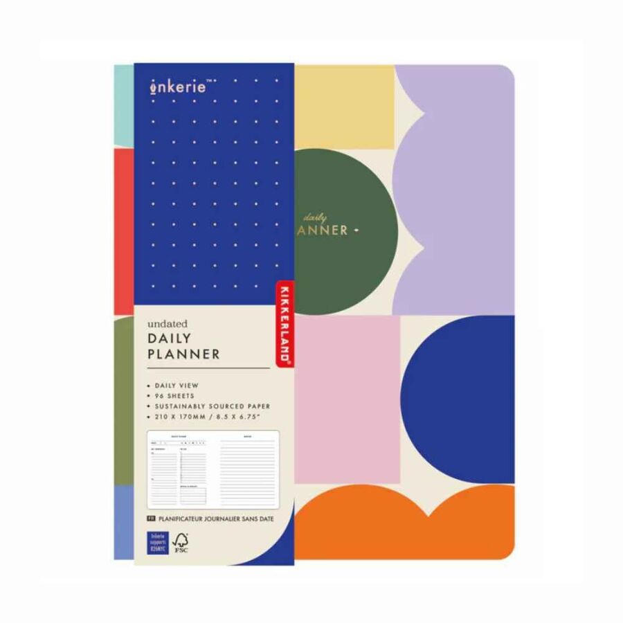 Kikkerland Tarihsiz Planlayıcı Günlük, günlük planlarınızı düzenli ve esnek bir şekilde takip etmenizi sağlayan kullanışlı bir ajandadır. Tarihsiz tasarımı sayesinde istediğiniz zaman kullanmaya başlayabilir, ara verdiğinizde sayfa kaybı yaşamadan planlamanıza devam edebilirsiniz.