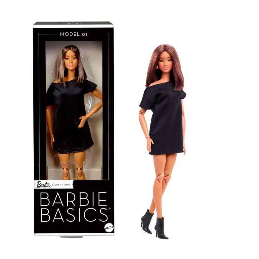 Model 01 Barbie; omzu açık tişört formundaki siyah elbisesi, sivri burun botları ve altın halka küpeleriyle sade ama güçlü bir stil yansıtır. Esnek ve tek beden uyumlu premium kumaş sayesinde elbise, Barbie Basics koleksiyonundaki diğer bebeklerle rahatlıkla kombinlenebilir. Made-to-Move gövdesiyle poz vermek ve sergilemek için idealdir.