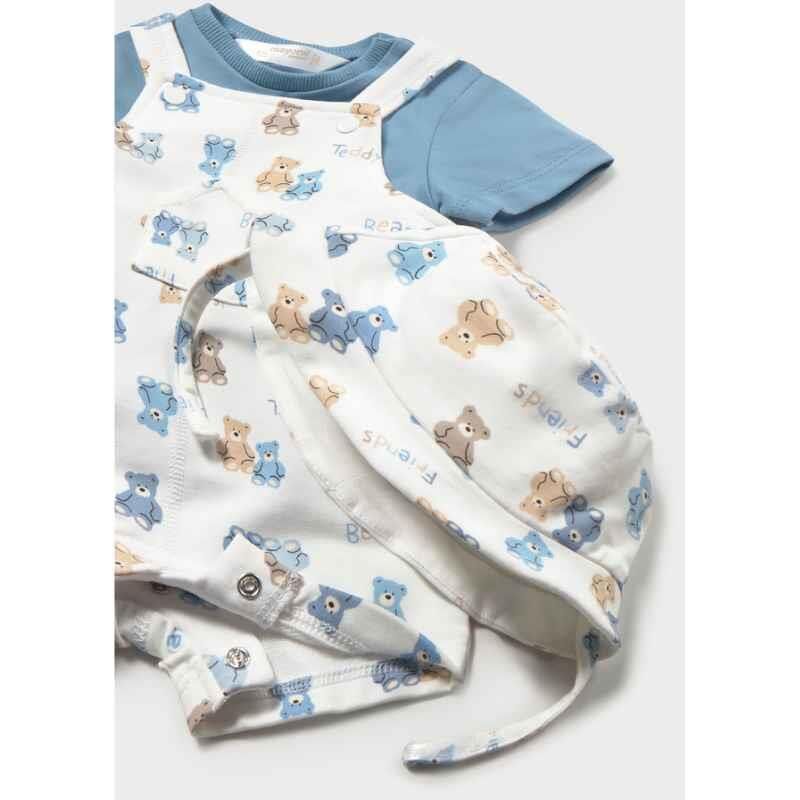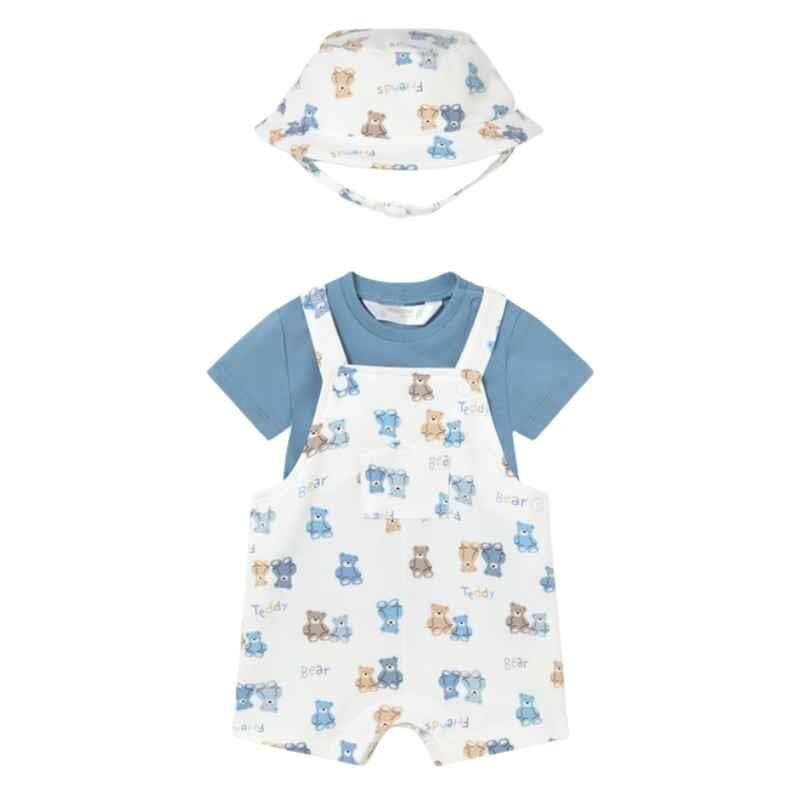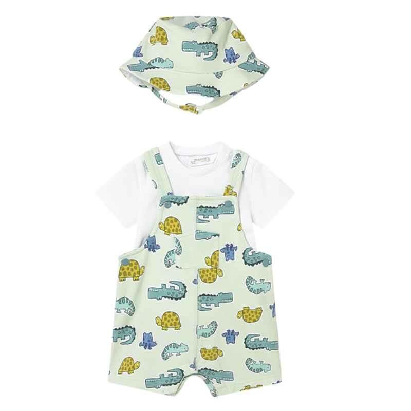Set içerisinde t-shirt, tulum ve uyumlu şapka olmak üzere 3 parça bulunur. Günlük gezilerde, aile buluşmalarında, tatilde veya özel anlarda rahatlıkla tercih edilebilecek bu takım, hem kullanışlı hem de şık bir kombin oluşturur. Şapkalı tasarımı sayesinde ekstra sevimlilik ve koruma sağlar.