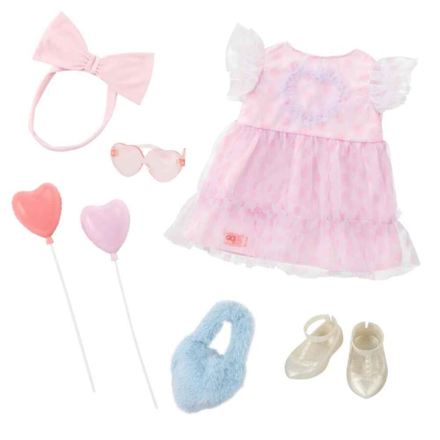 Parti şıklığı şimdi bebekler için! Our Generation All Heart Deluxe Kıyafet Seti, 46 cm (18 inç) bebeklerle uyumlu tasarımıyla özel gün oyunlarına renk katar. Fırfırlı elbisesi ve puantiyeli tül detayıyla tatlı bir stil sunarken, tamamlayıcı aksesuarlarıyla eğlenceli bir parti görünümü oluşturur.