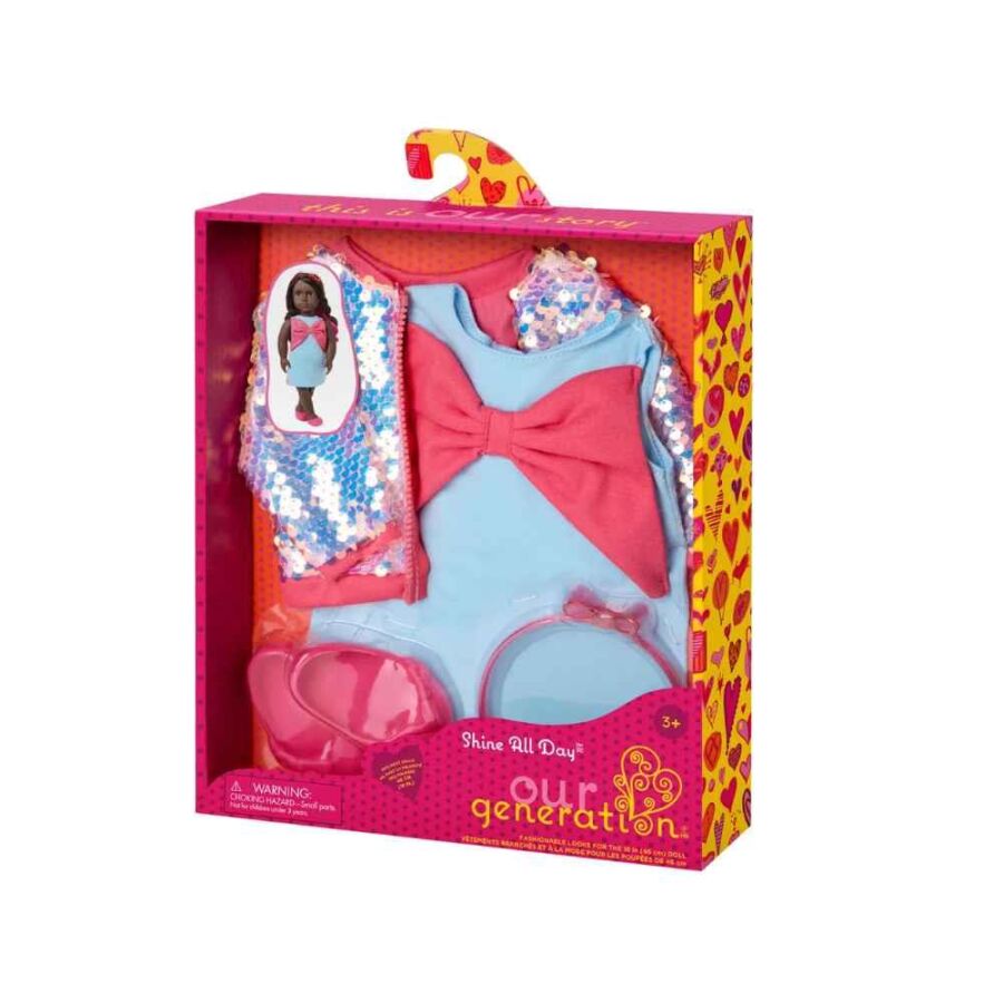 Parıltılı stil seven minikler için tasarlanan Our Generation Shine All Day Kıyafet Seti, 46 cm (18 inç) bebeklerin gardırobuna ışıltı katıyor. Gün boyu şık görünmek isteyen bebekler için hem eğlenceli hem de tamamlayıcı bir kombin sunar.