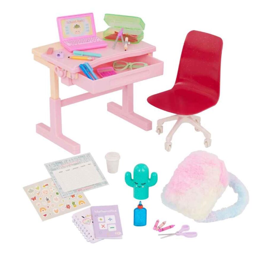 Okul temalı oyunları seven çocuklar için harika bir seçim! Our Generation School Dreams Okul Masası ve Sandalye Seti, 46 cm Our Generation bebeklerle uyumlu şekilde sınıf ya da evde çalışma alanı kurmaya imkân tanır.