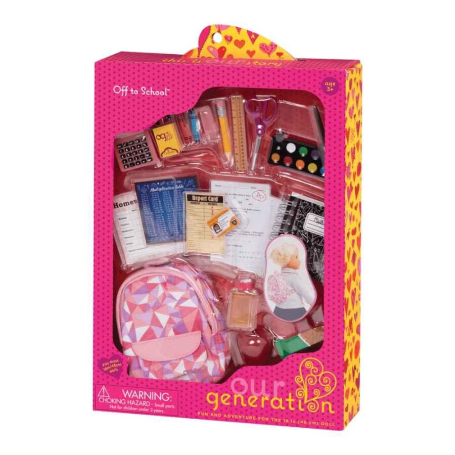 Okul heyecanı şimdi oyunlara taşınıyor! Our Generation Off to School Okul Seti, 46 cm (18 inç) bebeklerle uyumlu, sınıf temalı 33 parçalık zengin içeriğiyle çocukları eğlenceli okul maceralarına davet eder.