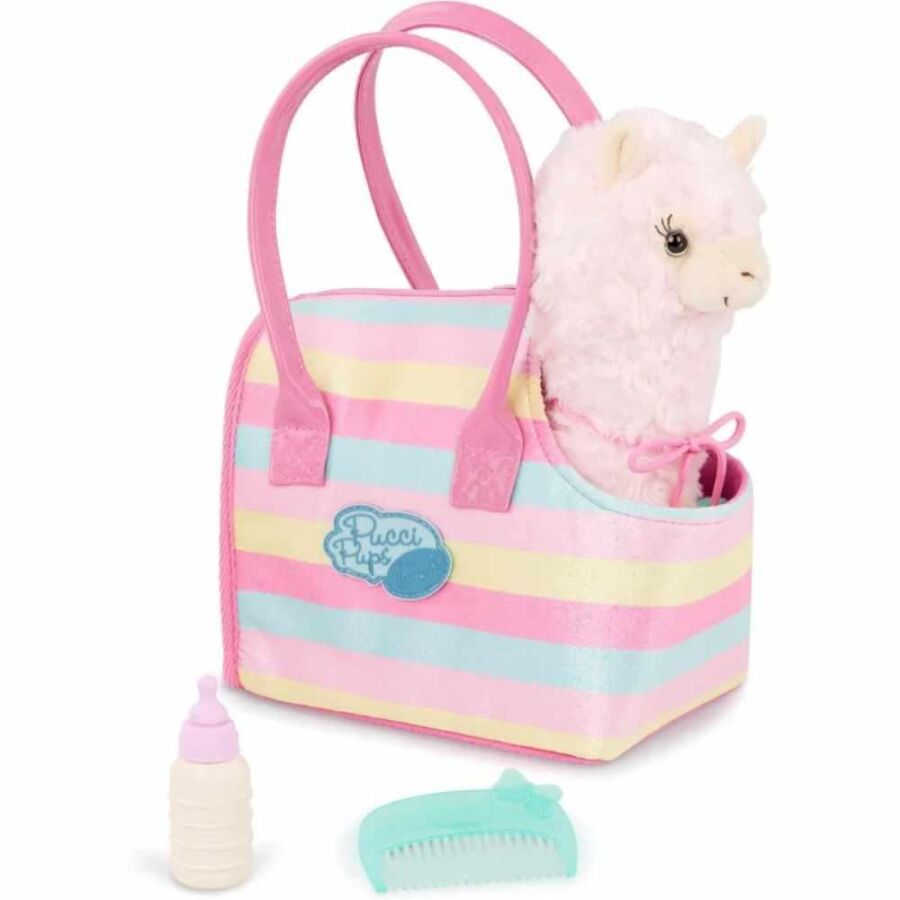 Pucci Pups Lama seti, yumuşacık dokusu ve sevimli detaylarıyla çocukların keyifle oynayacağı bakım temalı oyunlar sunar. Kulağındaki ponpon süsüyle dikkat çeken lama, şık taşıma çantası sayesinde her yere rahatlıkla götürülebilir.