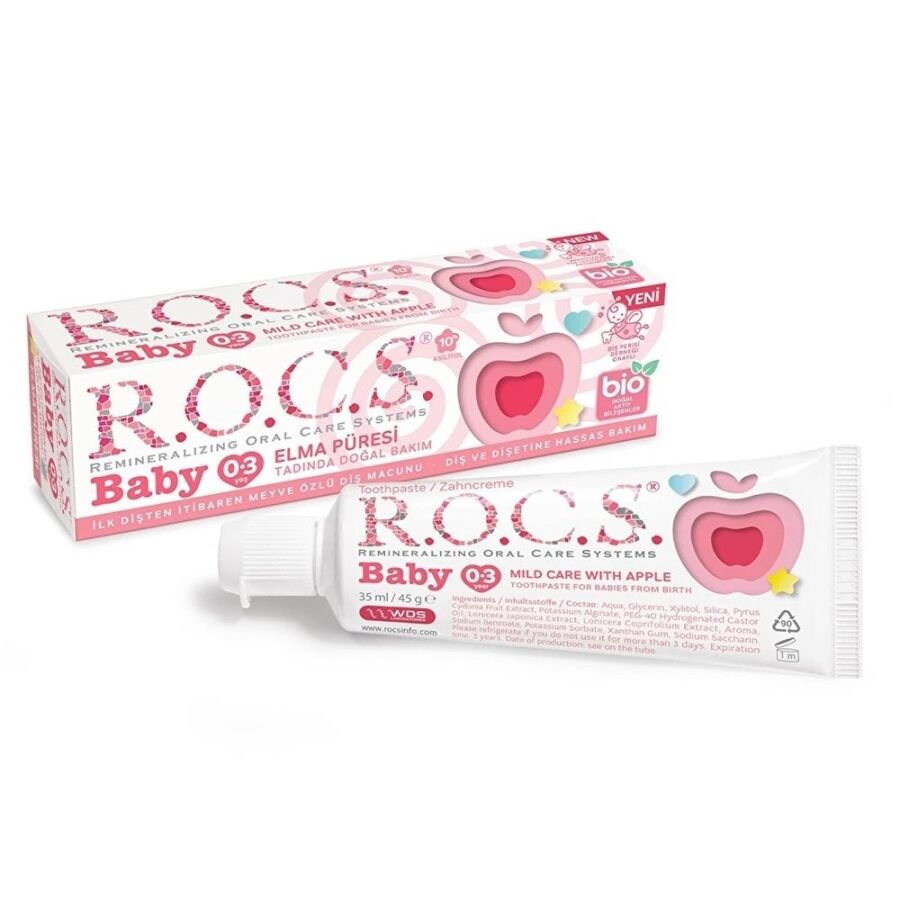 Rocs'un 0-3 Yaş bebekler için özel olarak formülize ettiği bu diş macunu doğal aktif bileşenlere sahiptir.