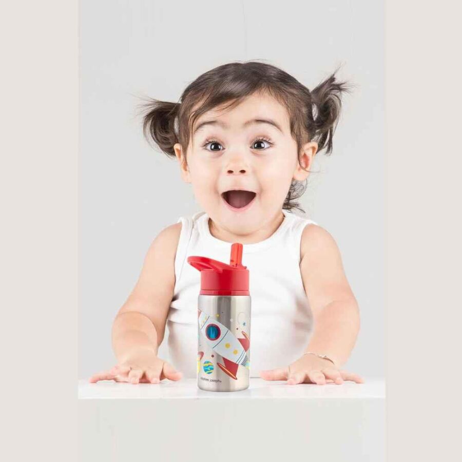 Stephen Joseph kalitesiyle üretilen bu uzay temalı paslanmaz çelik suluk, BPA, Ftalat ve PVC içermeyen malzemeleriyle ebeveynlerin içini rahatlatır.