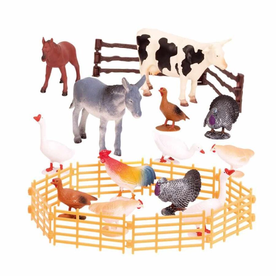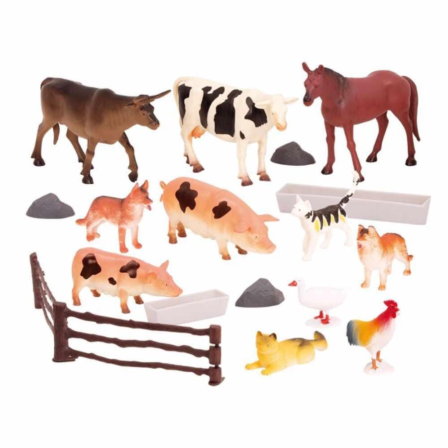 İnek, at, koyun, eşek, domuz, keçi, kaz, ördek, horoz, tavuk, köpek, kedi ve daha pek çok çiftlik hayvanı figürü ile birlikte; çitler, yemlikler ve dekoratif aksesuarlar bulunur.