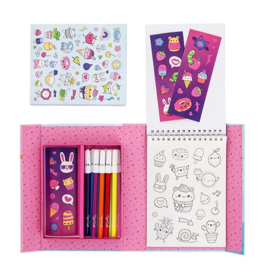 Setin içerisinden boyama sayfaları, çıkartma ve keçeli boya kalemleri çıkmaktadır.