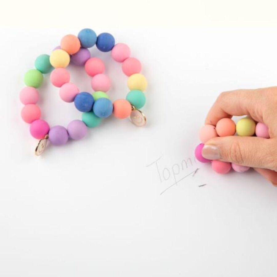 Top Model Bileklik Silgi, hem şık bir aksesuar hem de pratik bir silgi olarak kullanılabilen eğlenceli bir kırtasiye ürünüdür. Renkli toplardan oluşan tasarımı bileklik gibi takılabilir ve toplar aynı zamanda silgi işlevi görür. Üç farklı renk seçeneği bulunan bu bileklik silgiler, şeffaf esnek bant üzerine dizilmiştir. Ayrıca üzerinde gülen yüz figürlü altın renkli bir süs detayı yer alır. Hem okulda hem de günlük kullanımda çocukların favorisi olacak bu ürün, hediye olarak da ideal bir tercihtir.