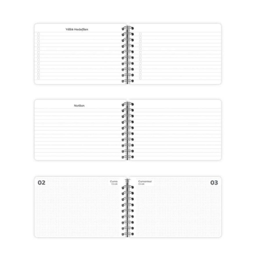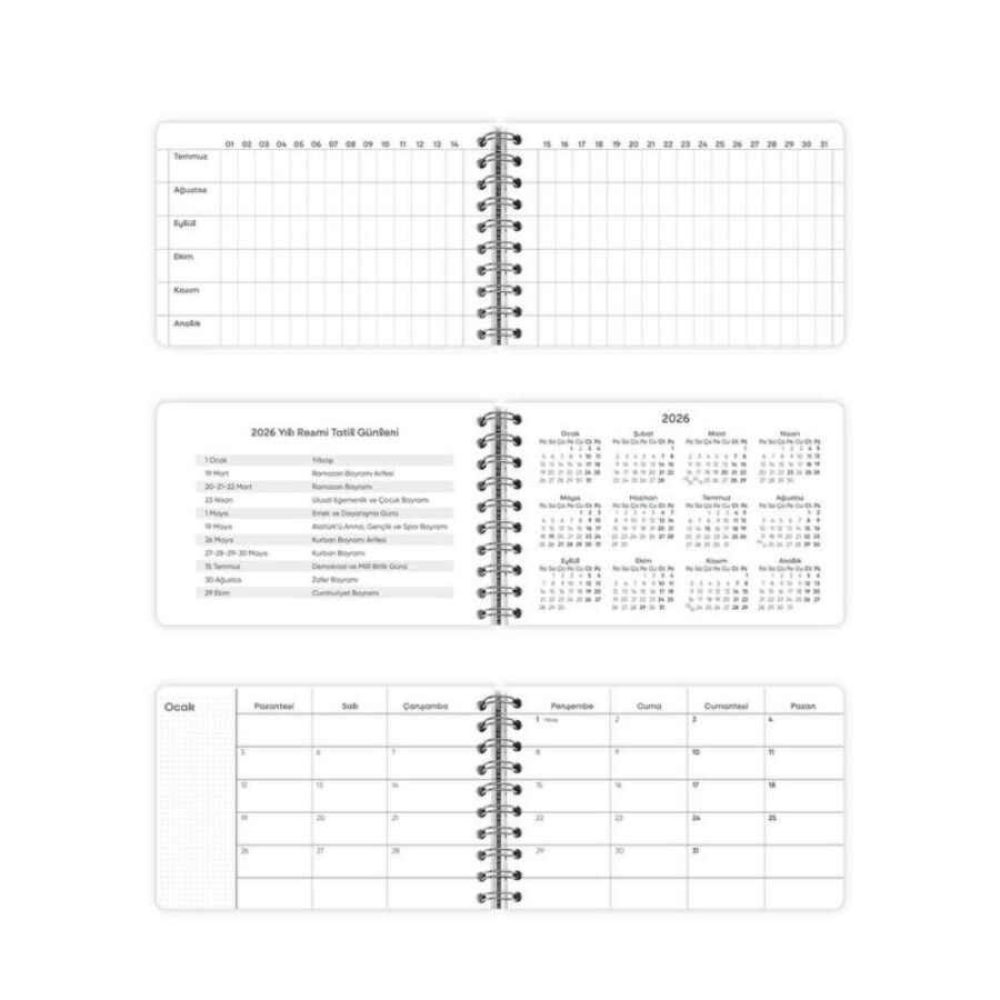 Spiralli yapısı ajandanın tamamen açılmasını sağlarken, soft kapak esnek ve hafif bir kullanım deneyimi sunar. Lastik kapama bandı, sayfaların güvenle kapalı kalmasına yardımcı olur. 13,5 x 9,5 cm ölçüsüyle çanta, cüzdan ya da çekmecede kolayca taşınabilir.