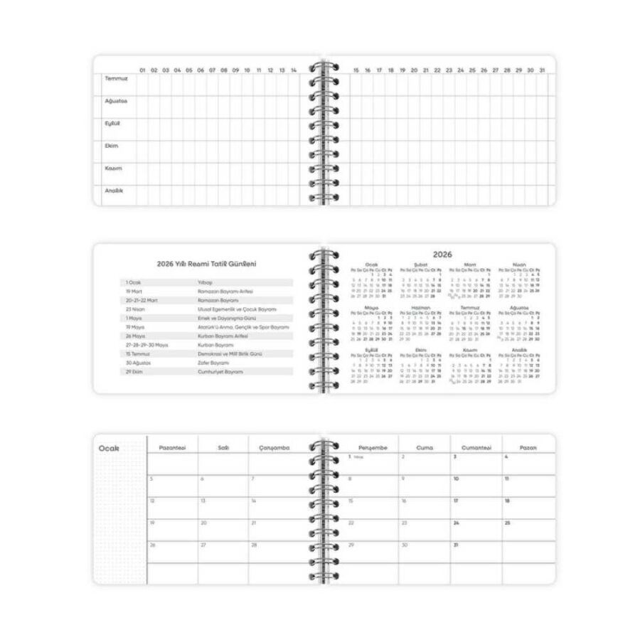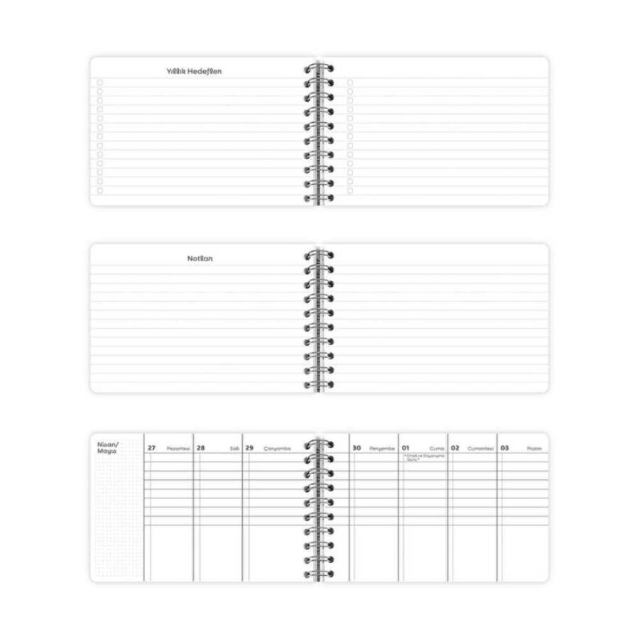 Spiralli yapısı, sayfaların rahatça açılıp kullanılmasını sağlarken; lastikli kapama bandı ajandanın çanta içinde güvenle kapanmasına yardımcı olur. 13,5 x 9,5 cm ölçüsü sayesinde cepte ve küçük çantalarda rahatlıkla taşınabilir.