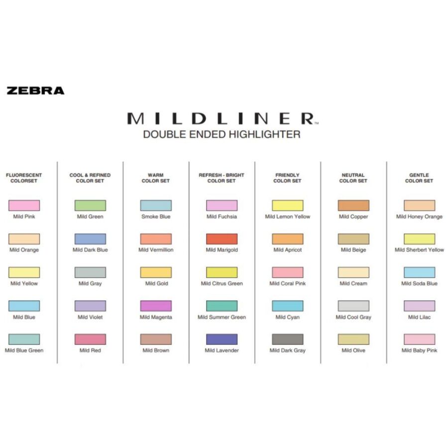 Set içerisinde Mild Brown, Mild Dark Gray, Mild Gray, Mild Violet, Mild Magenta, Mild Fuchsia, Mild Pink, Mild Red, Mild Coral Pink, Mild Marigold, Mild Vermilion, Mild Apricot, Mild Orange, Mild Gold, Mild Yellow, Mild Lemon Yellow, Mild Citrus Green, Mild Green, Mild Blue Green, Mild Smoke Green, Mild Summer Green, Mild Cyan, Mild Blue, Mild Dark Blue ve Mild Lavender olmak üzere toplam 25 renk bulunur.